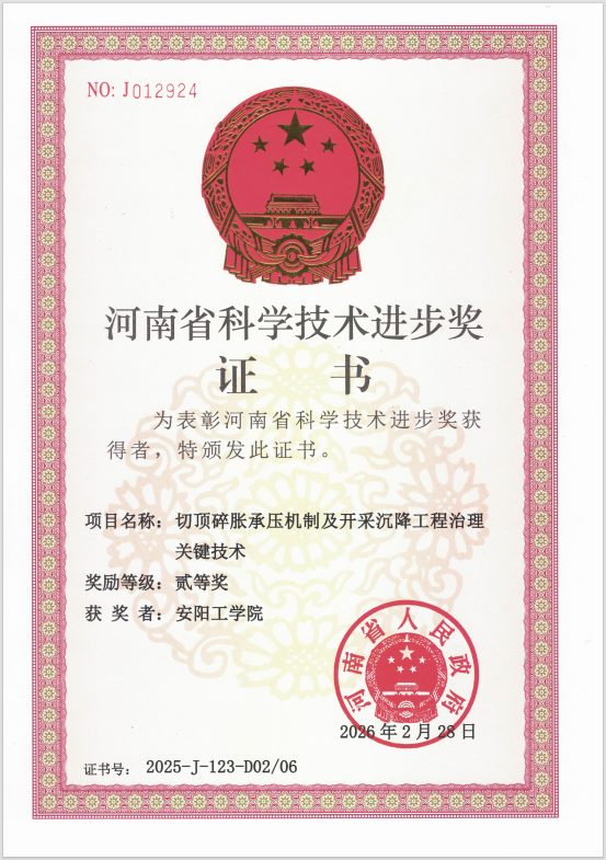 2026年3月5日,河南省人民政府发布关于2025年度河南省科学技术奖励的决定(豫政〔2026〕3号),我院陈上元博士、闫春岭教授参与完成的研究项目《切顶碎胀承压机制及开采沉降工程治理关键技术》获得河南省科技进步奖二等奖。